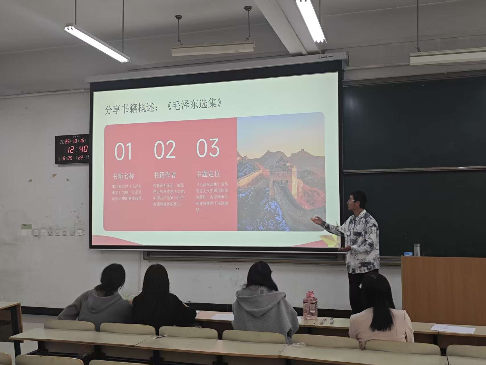 10月16日中午,复试如约而至。图书馆馆长张勇、综合业务部部长段敏敏、读者服务部部长蔡建康、阅读推广团队指导老师叶超、张婷婷,以及前任团队核心成员党童昕、王梓坤等共同组成评审团。复试者就“阅读推广活动策划”或“经典书目阅读分享”二选一进行展示。复试中,面试者们分享了《长安的荔枝》、《悉达多》、《第七天》等经典书籍,还现场策划了“大学生趣味阅读大闯关”、“盲盒书籍漂流”等创意活动方案。随后,评审老师们围绕方案可行性、逻辑完整性、书籍解读维度等进行提问,全面考察了面试者的阅读素养与策划能力。